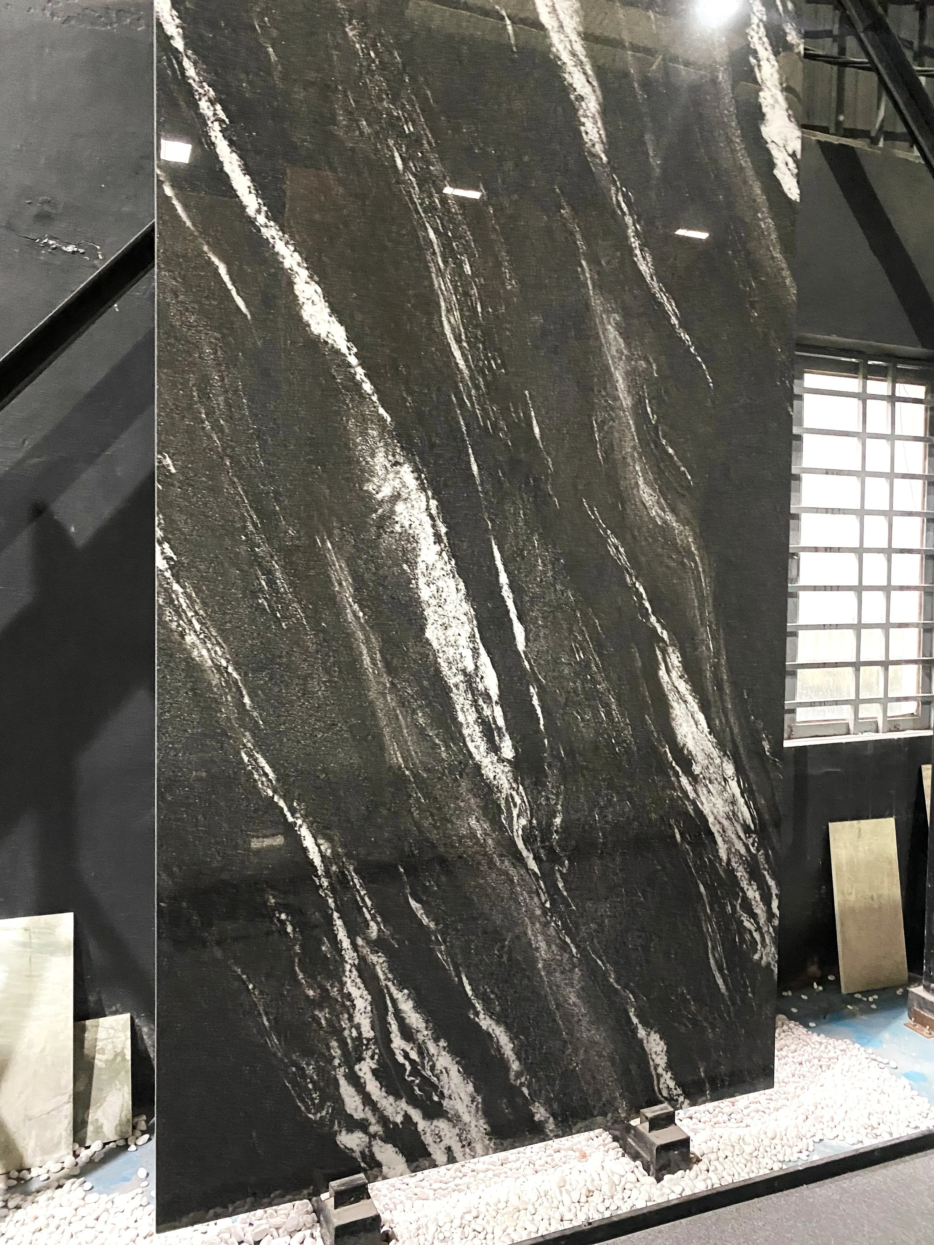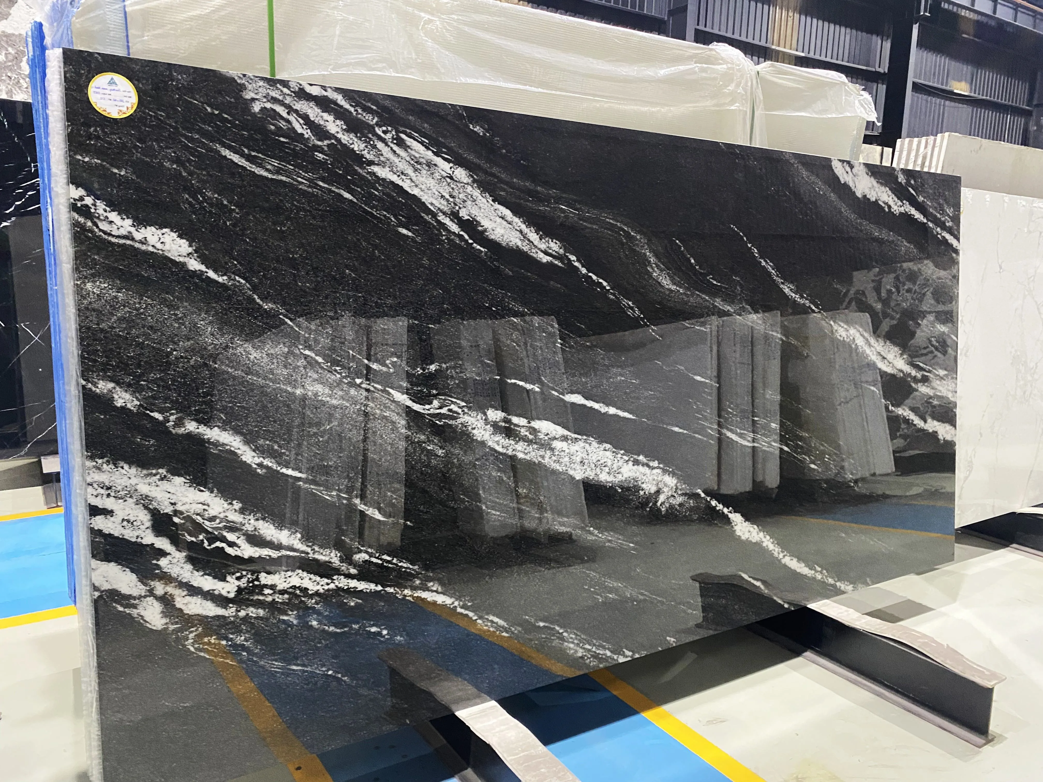 Tấm đá trong hình gây ấn tượng mạnh với nền đen huyền bí, được tô điểm bởi những đường vân trắng tự nhiên trải dài như những dải sóng bạc trên biển đêm. Sự tương phản sắc nét giữa hai gam màu mang lại vẻ đẹp sang trọng, cá tính và đầy chiều sâu. Đây là lựa chọn hoàn hảo cho các công trình kiến trúc cao cấp, đặc biệt phù hợp trong không gian hiện đại, tinh tế và đẳng cấp.