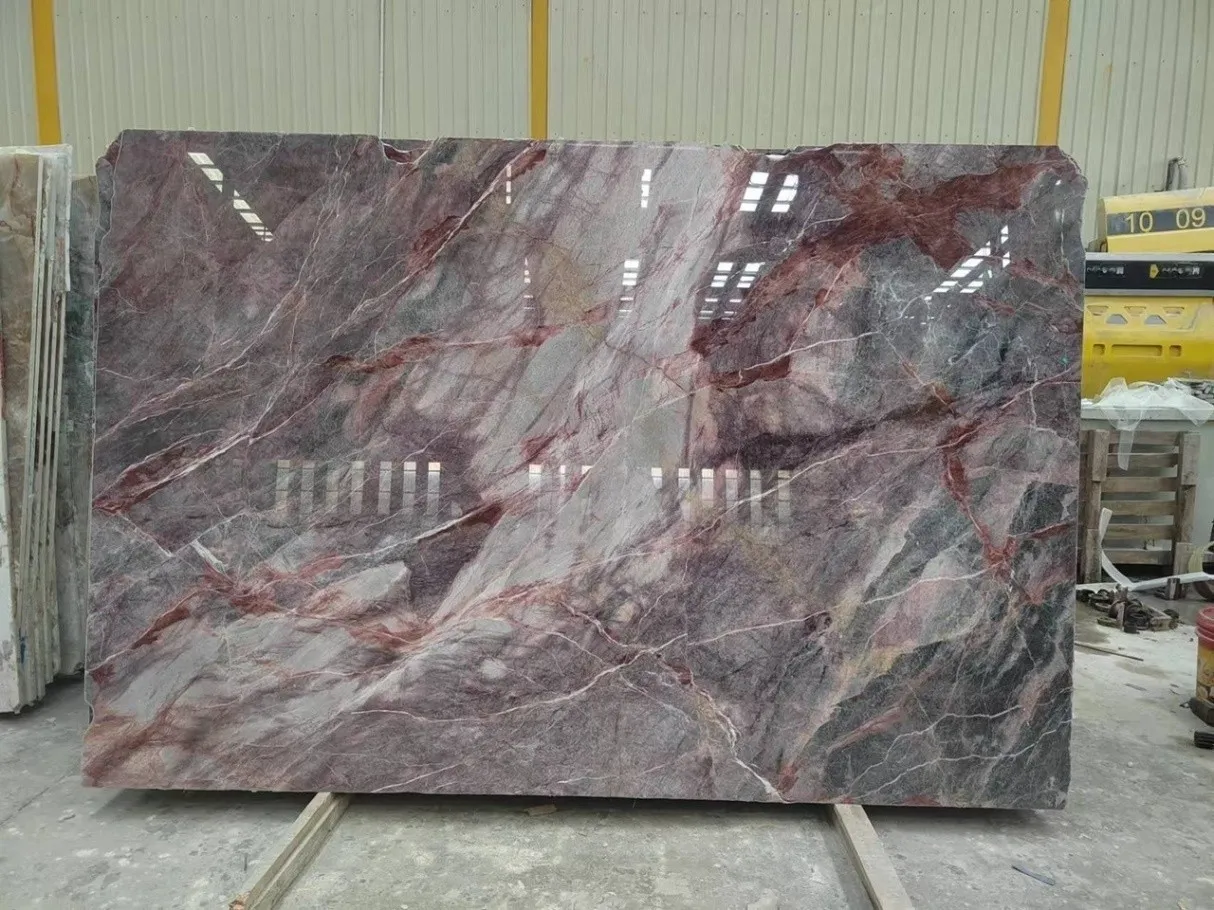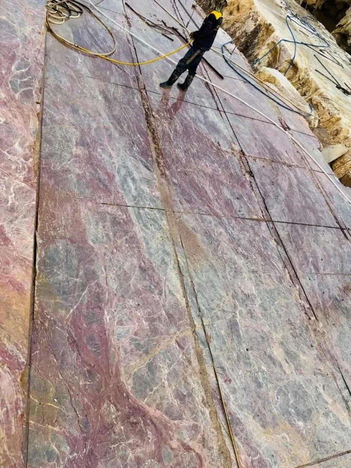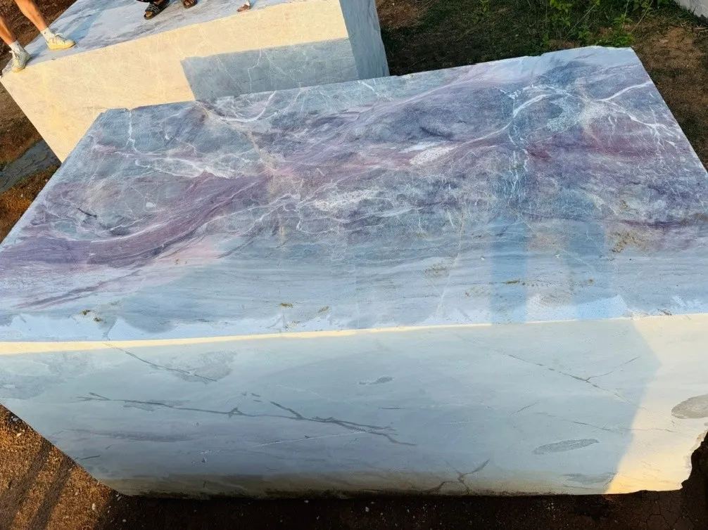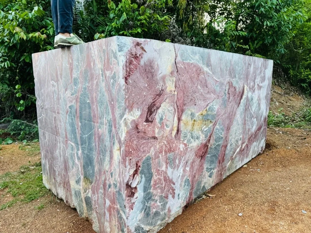 Khối đá Đá cẩm thạch cầu vồng trong hình nổi bật với gam màu đa sắc, trải dài từ tím, hồng đến xám xanh, tạo nên những dải vân mềm mại tựa cầu vồng thiên nhiên. Sự pha trộn hài hòa của màu sắc mang lại vẻ đẹp độc đáo, sống động nhưng vẫn toát lên sự sang trọng và tinh tế. Đây là loại đá lý tưởng để tạo điểm nhấn cho các công trình cao cấp, đem lại cảm giác mới mẻ và khác biệt cho không gian kiến trúc.